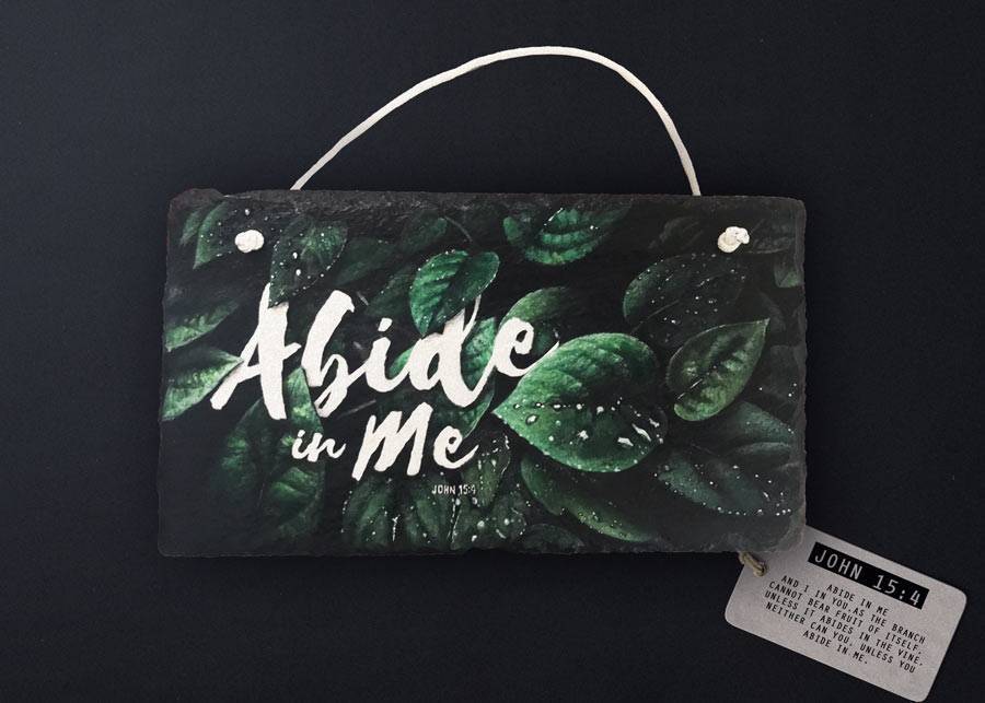 This artwork is painted in acrylics on natural slate, and then varnished. Set against a backdrop of dew-covered leaves are painted the words “Abide in me” from the scripture John 15:4.