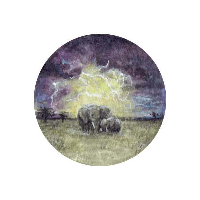Miniature painting of an African Elephant and her calf weathering an electric storm