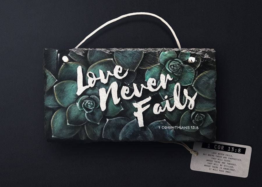 A botanical Slate painting with the phrase “Love Never Fails” from the scripture 1 Corinthians 13:8.