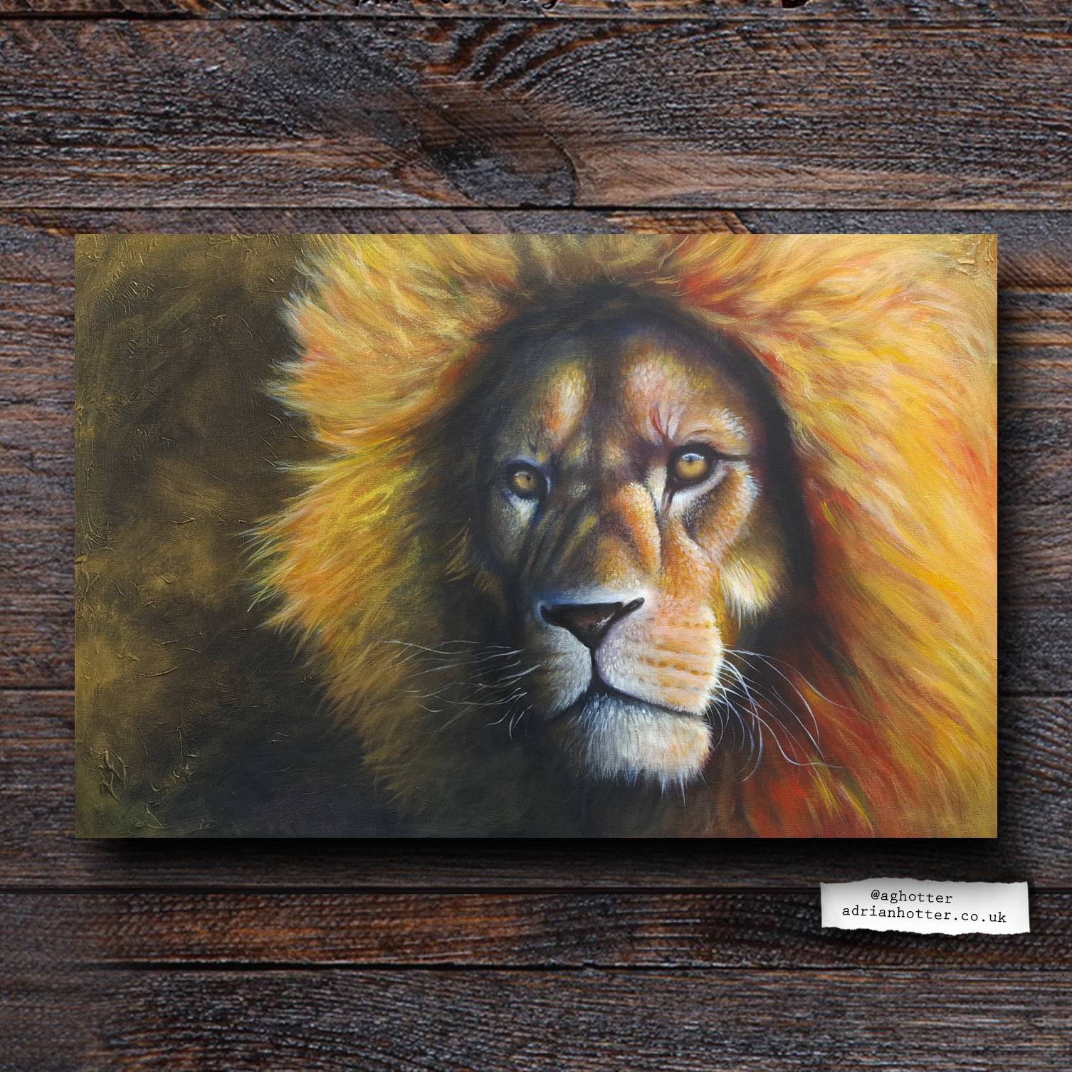 Portrait painting of a male lion bathed in golden light.
