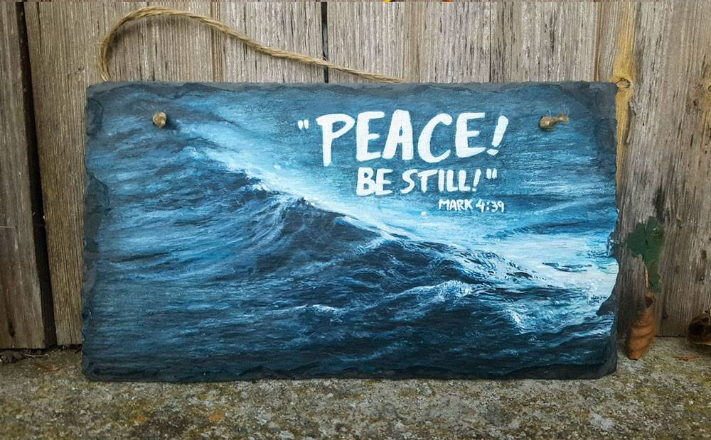 Slate painting of a wave and the line from the Scripture in Mark 4:39.