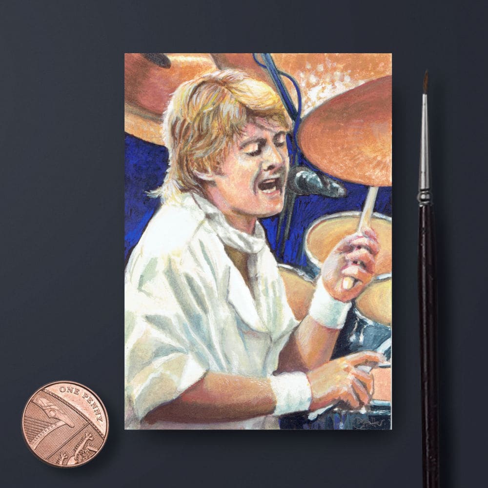 An original, signed, gouache painting of Queen drummer, Roger Taylor.