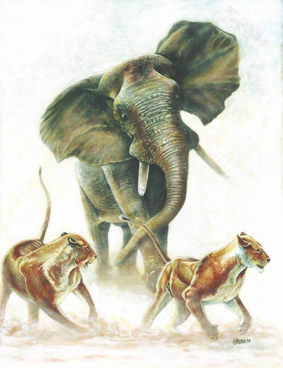 An acrylic painting of an African Elephant chasing down two lionesses. This painting was a gift to my wife while we were still dating as she has a real love for elephants.