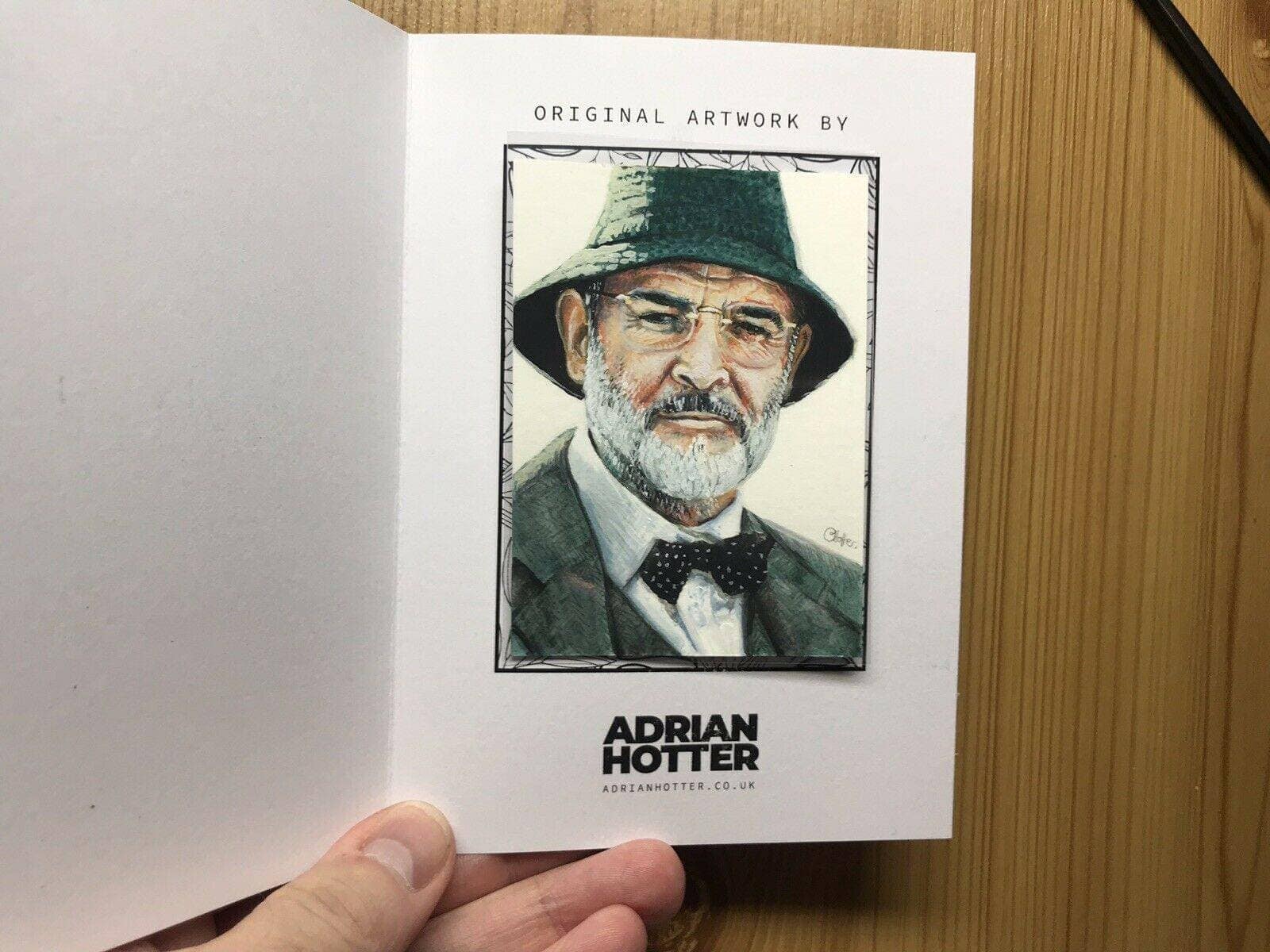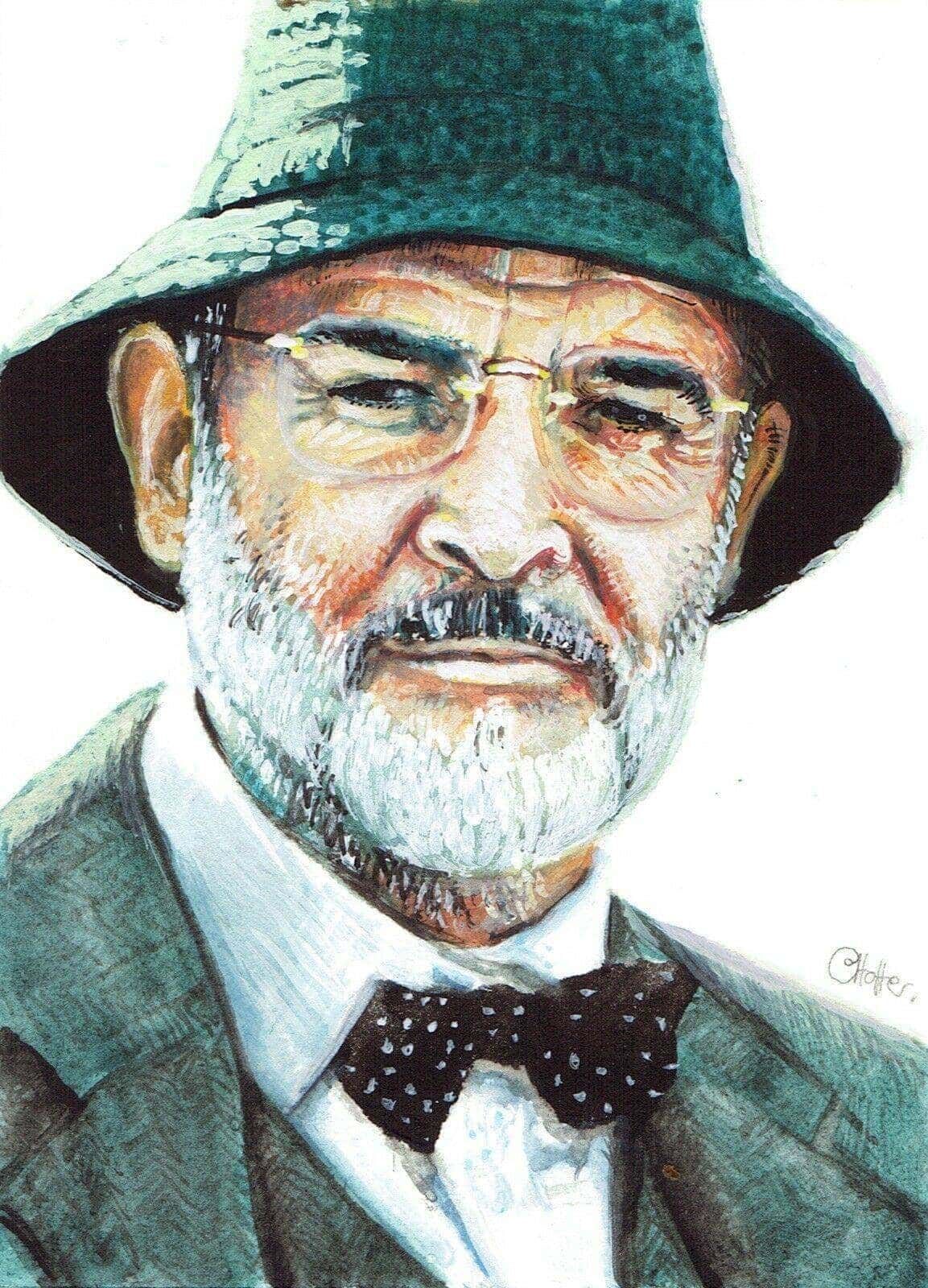 An original, signed, gouache painting of film legend Sean Connery in his role as the father of Indiana Jones in “Indiana Jones and the Last Crusade”